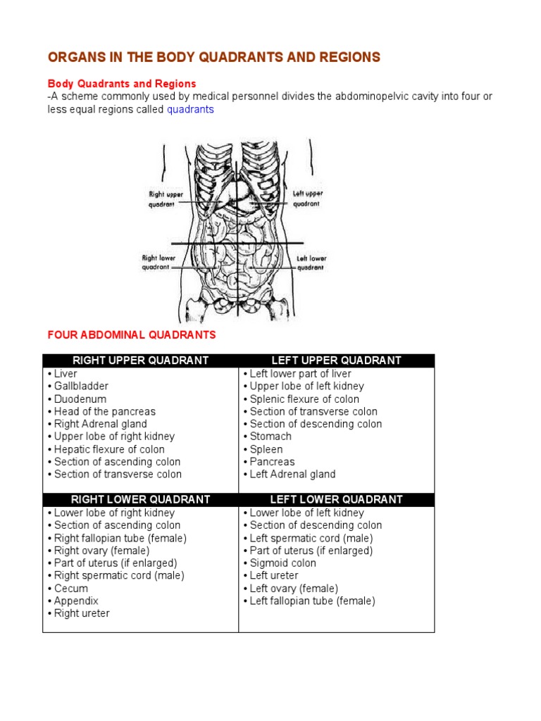 What organs are in each abdominal quadrant? These classifications are useful to clinicians during an abdominal exam because they can help with differential diagnoses. In this video, we will identify the major organs in the thoracic and abdominopelvic cavity and the abdominopelvic quadrants and regions. Anatomical terms allow health care professionals to accurately communicate to others which part of the body may be affected by disorder. Labeled examination graphic with hypochondrium, hypogastrium and hypochondriac as anatomical body organs position. Human body quadrants anatomy 9 quadrants human body quadrants diagram 4 abdominal quadrants organs in quadrants of abdomen abdomen quadrant region right upper quadrant. We just covered this in class a night or two ago. The abdomen can be divided into nine anatomical regions and four quadrants. Diagram showing which organs (or parts of organs) are in each quadrant of the abdomen. The quadrants are referred to as the left lower quadrant, left upper quadrant, right upper quadrant and right lower quadrant, as follows below. 1.5e anatomical terminology_ abdominopelvic regions and quadrants. The root of a term often refers to an anatomical position. Abdominal organ anatomy quadrants / physicians and anatomists divide the human abdomen into four different regions or quadrants.